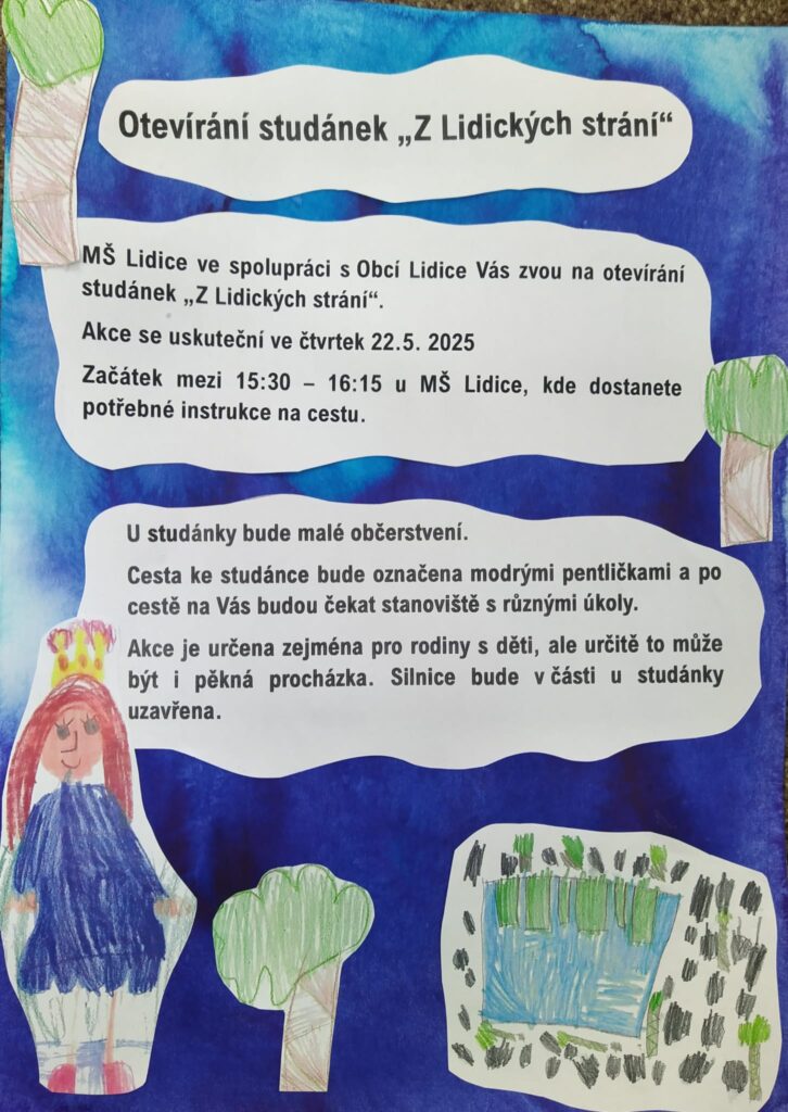 Na akci „Otevírání studánek“ nás čekali velké přípravy. Děti připravovali plakát a dospěláci pomáhali s vymýšlením stanovišť. Pro děti byly připraveny stanoviště s úkoly a na konci stezky u studánky na ně čekala studánková víla. Počasí bylo krásně studánkové a po celou dobu stezky nám vydatně pršelo. Ale ani to nás neodradilo a našlo se hodně odvážlivců, kteří stezku v dešti prošli a na konci nám pomohli studánku odemknout.